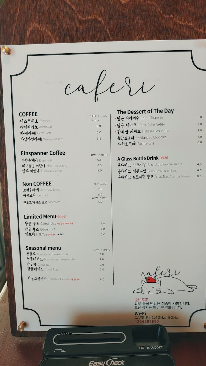 Cafe Ri specializes in creating a cozy atmosphere that feels like home, where both cat lovers and food enthusiasts can find joy. As you step inside, you're greeted by the soft purring of cats and the sweet aroma of baked goods. The cafe proudly features their signature 제주 당근케이크 (Jeju Carrot Cake), made with locally sourced Gujwa carrots and a creamy cheese frosting, all for only ₩7,500. This healthful treat is not just a feast for the palate but also a visual delight, with its vibrant colors promising a burst of flavor in every bite.